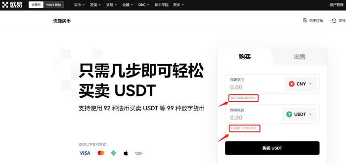 在欧易交易所中可以看到,最低交易金额为10 ,目前1 USDT价格为7.04