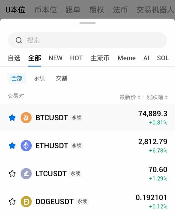 2. 新手建议选择U本位永续合约进行交易,点击左上角选择交易对,如BTCUSDT永续,意思是使用USDT进行BTC的合约交易。