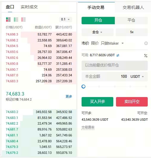 3. 选择“开仓”,选择委托方式,如“市价委托”;调整杠杆倍数如5倍;输入开仓数量,如100 USDT;根据对走势的判断,如果认为BTC会涨则点击“买入开多”,认为会跌则点击“卖出开空”。