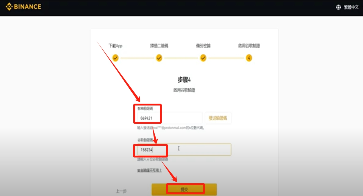 输入电子邮件的验证码,这里的谷歌验证码就输入你手机上面这个动态密码,输入完成点击【提交】就完成两步骤登入验证了。