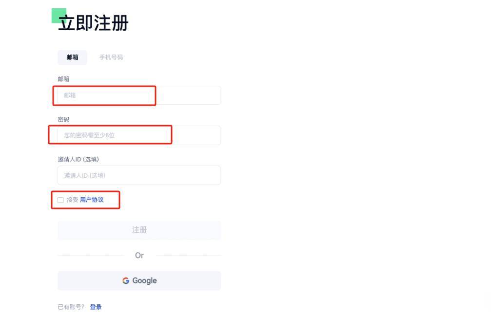 2、在注册页面,根据提示填写信息(邮箱、登录密码等),勾选“接受用户协议”,点击“注册”。