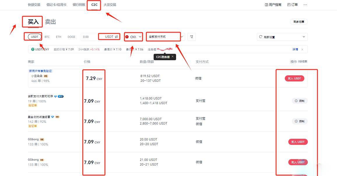 4、认证结束后,点击首页页面上方导航栏的“买币”--“法定货币交易”,购买货币之前通常需要购买一定数量的USDT,以便交易。选择C2C,选择买币,选择USD,根据自己的需求选择合适的商家。