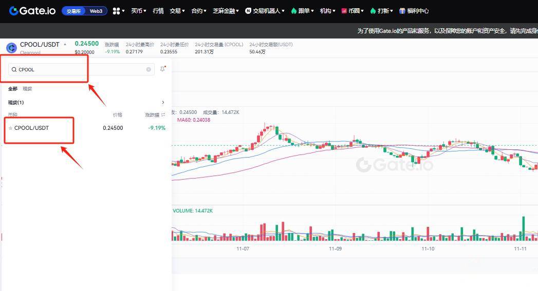 6、在进入也页面后,搜索CPOOL,选择CPOOL/USDT,就可以看到该币种的交易信息以及市场信息