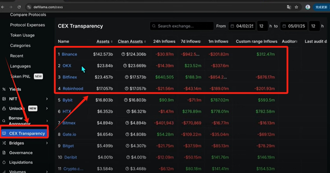 安全性里面尤其要看储备金量、储备金证明还有市场的口碑。在第三方的监控网站Defilama里面,我们就能够找到下面的CEX选项。这个CEX指的就是所有的软件,它的储备金的一个由高到低的排名。我们可以看到排名第一的就是币安软件,是142个billion,也就是1400多亿美金。排名第二的就是欧易平台,是24billion,240亿美金。排名第三的是bitfinex,排名第四的是Robinhood。所以我们看币安软件它是断档式的领先的,OKX软件紧随其后。代表着这两家软件是有全球最多用户的钱存到里面的,也就是这两家软件给用户的感觉是最有安全感的。