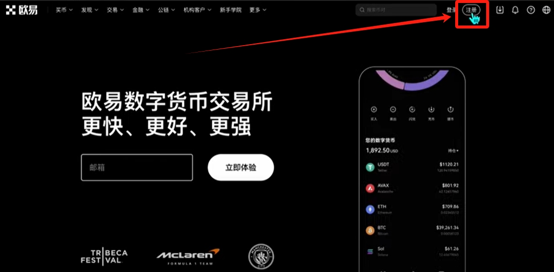 首先我们来到欧易软件的官网,点击右上角的【注册】。