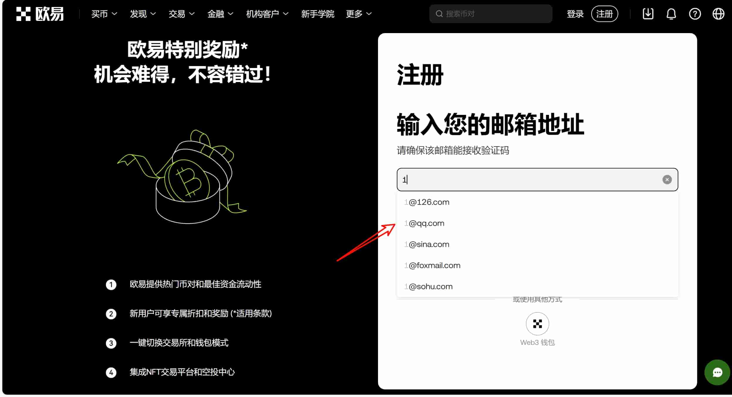 欧易目前是先需要使用邮箱注册再去绑定手机号,这个时候就可以输入我们的邮箱地址,然后点击【注册】。