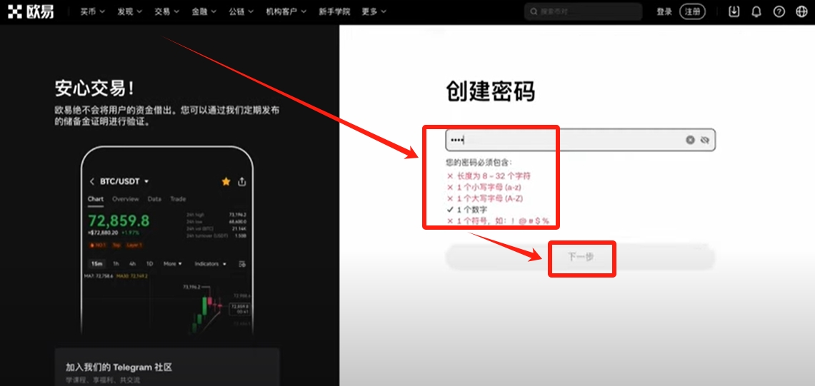 验证之后为我们的欧易账户创建一个密码,根据提示设置账户登录密码,点击【下一步】。