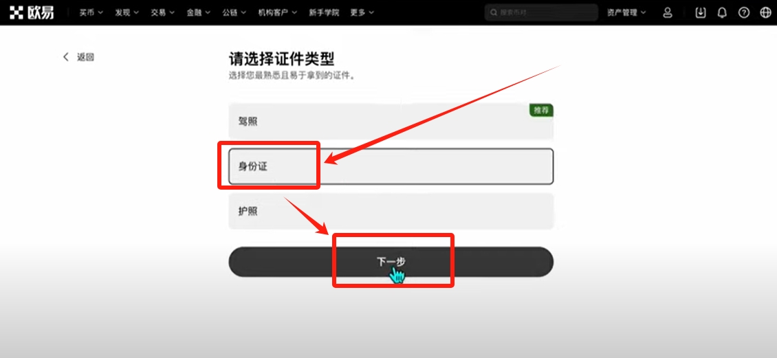 选择我们用来认证的证件类型,你是想用驾照、身份件还是护照。我这里选择“身份件”,点击【下一步】。