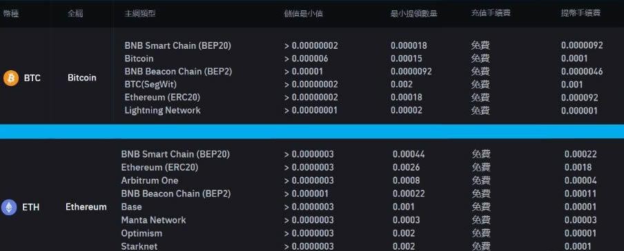 如果想把BTC、ETH 转出币安的话,可参考下图整理,手续费则远低于USDT,读者可以依照个人的习惯以及当下的链上壅塞程度,选择适合的链种转出BTC 和ETH。