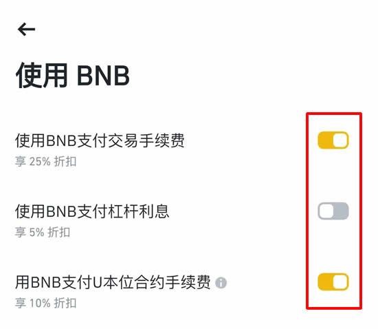 开启后,在币安交易所内各项交易的手续费,将优先使用BNB 币折抵,享有10%的折抵优惠。