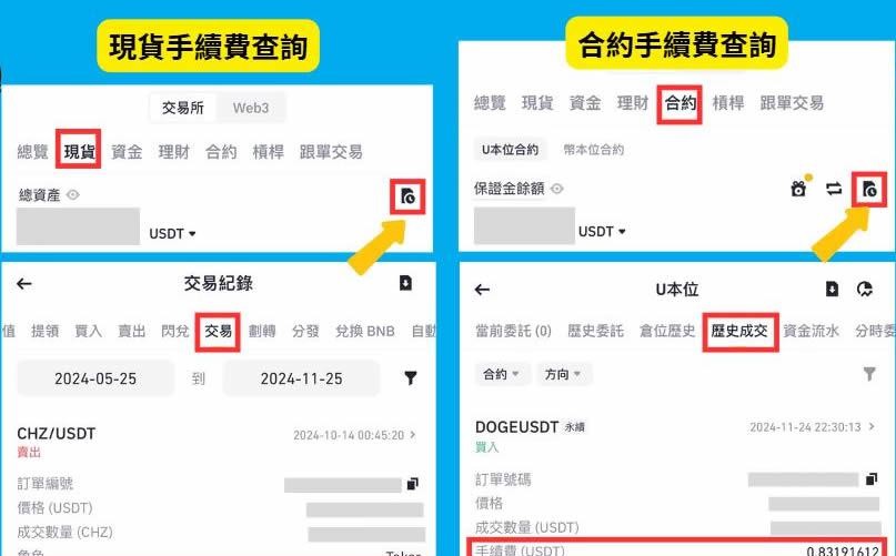 打开币安APP→点选个人钱袋→ 在现货资产的金额右边,点选「历史纪录」图示→ 从交易纪录中找到手续费支出数字