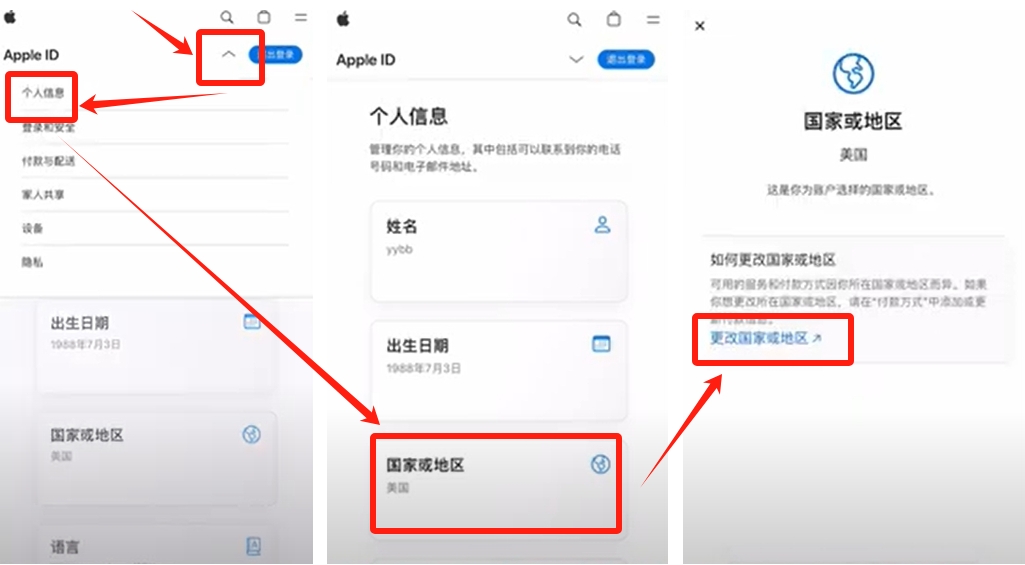 然后点击向下的小箭头,选择“个人信息”,点击“国家或地区”,再点击“更改国家/地区”。