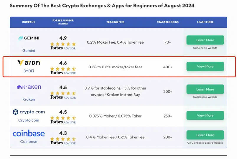 BYDFi 被福布斯 Forbes 评为全球最佳虚拟货币交易所,和 Coinbase、Kraken、Gemini 等国际顶级交易所齐名