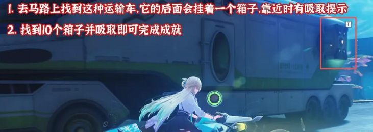 去马路上找到运输车,它的后面会挂着一个箱子,靠近有吸取提示