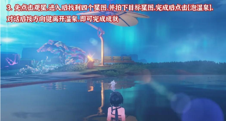 先点击观星,进入后找到四个星图,并拍下目标星图,完成后点击泡温泉,对话后按方向键离开温泉,即可完成成就