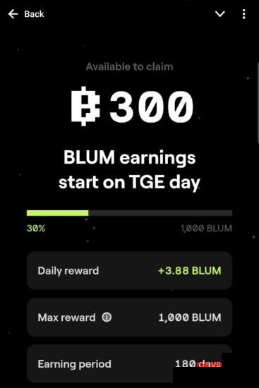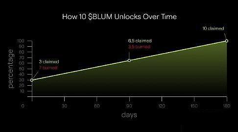 在Token Generation Event(TGE)开始时(预计为2025年6月24日至28日之间),合资格用户可立即申领其BLUM总分配额的30%。剩余的70%则会于180天内逐日线性解锁。不过,你只有唯一的一次申领机会。一旦申领,尚未解锁的那部分代币将被永久销毁,这将降低总供应量、提升稀缺性。