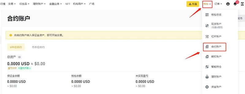 13、您必须将资金转入币安合约钱袋中,才能进行第一笔加密货币衍生品交易。 请登录币安并点击【钱袋】-【合约】。
