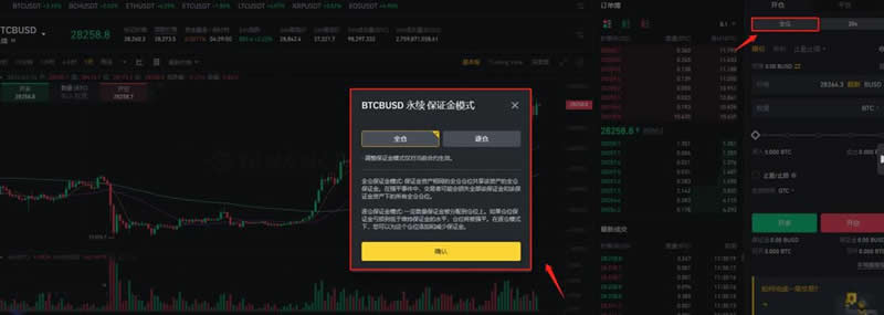 19、选择【保证金模式】,该模式仅适用于选定的期货合约,在【全仓】和【逐仓】之间进行选择,然后点击【确认】。