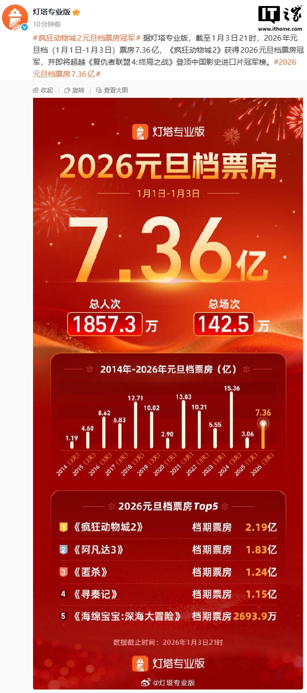 1 月 3 日消息,据灯塔专业版,截至 1 月 3 日 21 时,2026 年元旦档(1 月 1 日-1 月 3 日)票房 7.36 亿,《疯狂动物城 2》获得 2026 元旦档票房冠军,并即将超越《复仇者联盟 4:终局之战》登顶中国影史进口片冠军榜。