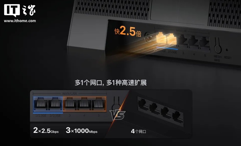 从官方介绍获悉,腾达泰山 BE7200 Ultra 路由器支持 Wi-Fi 7,双频并发速率可达 7141Mbps,配有四核 2GHz CPU,算力可达 18400 DMIPS,还配有双 2.5G 口 + 3 个千兆口。