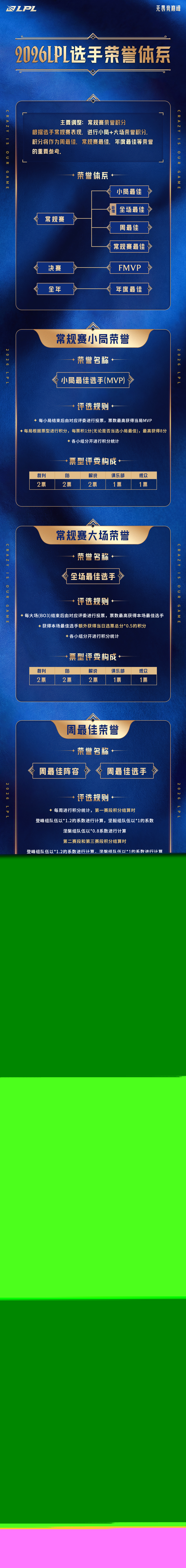 2026LPL 选手荣誉体系也将进行调整,主要调整为常规赛荣誉积分,根据选手常规赛表现,进行小局 + 大场荣誉积分。积分将作为周最佳、常规赛最佳、年度最佳等荣誉的重要参考。