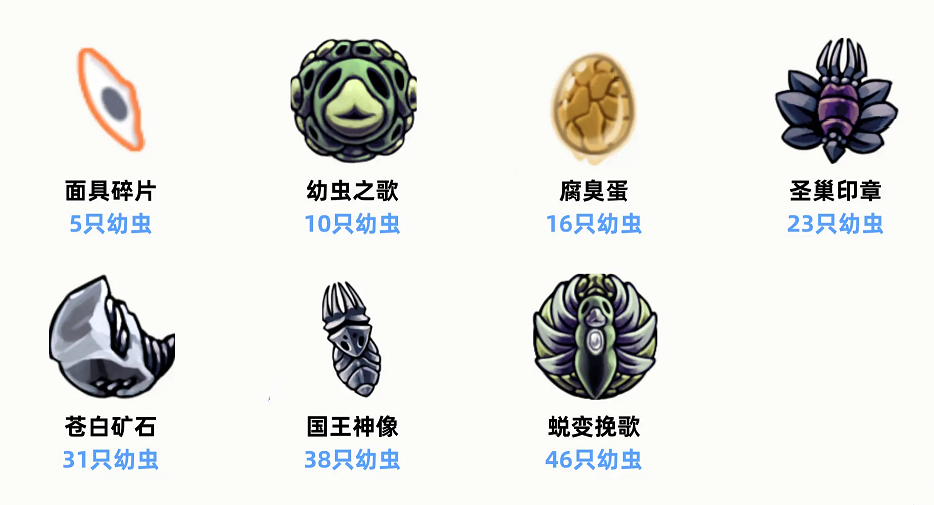 空洞骑士:丝之歌皇家水道幼虫收集,收集奖励仅与总数相关,即根据营救的数量给予奖励,共计46只幼虫