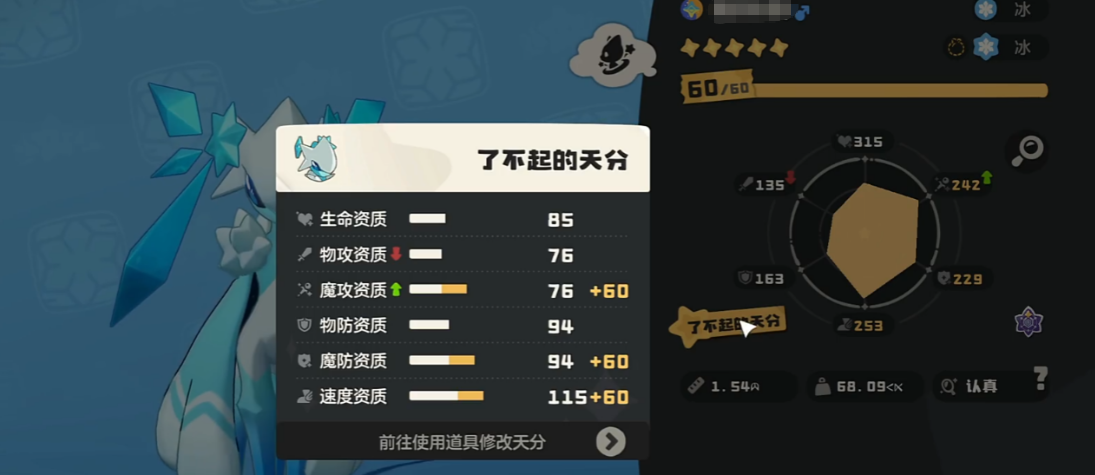 获取高天赋精灵主要有两种路径:野外捕捉与孵蛋培育。前者完全依赖随机性,首只即出“了不起”属小概率事件;后者可控性更强,尤其使用已知高天赋个体作为亲本时,后代优质天赋出现率显著提升。若已培养的精灵天赋欠佳,可使用开心豆或果儿糖进行重置操作,但每次仅能修改未锁定属性,需多次确认,流程较为细致。