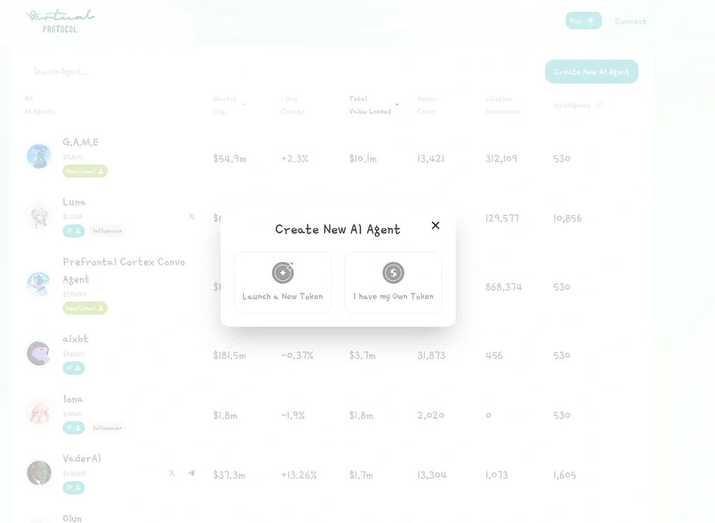 Virtuals 的Luna 可以透过该平台购买,所有交易都必须透过该协议的原生代币VIRTUAL 进行。