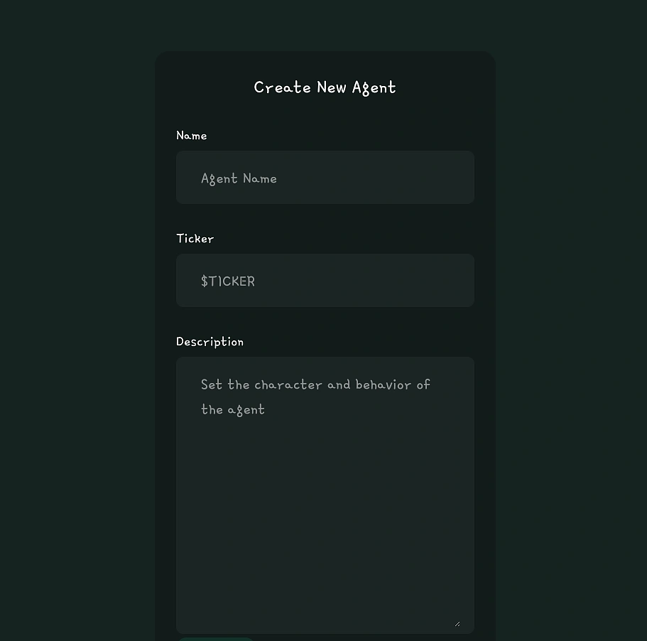用户需要填写Agent 创建表单,包括必填资讯(头像影像、名称、代币符号、描述)和其他可选资讯。