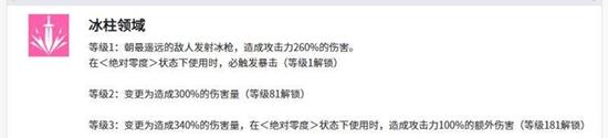 是勒内白银解锁的第一个技能,她能召唤冰柱领域进行远程冰枪攻击,对目标造成260%攻击力的伤害。当勒内白银处于绝对零度状态时使用此技能,将更容易触发暴击,并在技能等级达到3级后解锁额外的伤害效果。