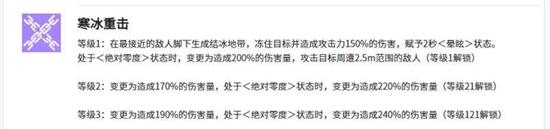 会根据与敌人的距离生成一个结冰地带,处于该地带内的敌人会被冻结。此技能能对目标造成150%攻击力的伤害,并附加2秒的眩晕效果。若在绝对零度状态下施放,伤害将提升至200%,并且会对周围2.5米范围内的所有敌人都造成此伤害,随着技能等级提升,伤害百分比还会进一步提高。
