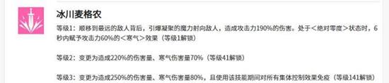 白银的第三个技能,她会瞬移至距离最远的敌人身后,发动一次远程魔力攻击,造成190%攻击力的伤害。在绝对零度状态下,此攻击会附加相当于自身攻击力60%的寒气伤害加成。当技能等级提升至3级,伤害量会变更至250%,这个效果通常需要角色达到141级才能解锁。