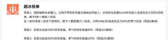 技能让勒内白银凝聚魔力,以铁手甲发动重击,对6米范围内的所有敌人造成约300%攻击力的伤害,并附带4秒的眩晕效果。在绝对零度状态下使用,她还能在24秒内,每2秒对敌人造成一次相当于60%攻击力的持续魔力寒气伤害。