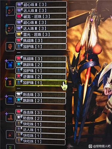 巨戟头手脚,雷颚胸,铠龙腰,武器属性激化两会两属一斩(不想炼属性用麻痹爆破也行,注意要会心激化!两攻两会一斩)护石出个飞燕看破1带个攻击孔就行(我这是魔的看破飞燕挑战),护石没挑战把刺击珠换成挑战就行,如果用物理棍就飞燕攻击1,看破5换攻5,来说说这套配装的优越性,首先是进怒就常态80会心,其实对比力解黑丝套的满会我感觉期望差不多,而且有雷颚保抖擞,炼化简单,只用出一个巨戟技能就行,有回距二耳塞一,不喜欢相杀的可以把逆袭换别的珠子,舒适度可以,巨基四件套配上加护3和铠龙2生存能力非常恐怖(巨戟护盾是110s刷新一次,能抵挡80伤害),虫棍可以说是最容易挨打的武器之一了,用了这一套之后我打巨基连秘药都基本不吃了 出个快吃三再血不满的时候偷喝小饮料保无伤覆盖率,我用爆破棍打锁刃链子急袭斩最后一刀能打145,感觉伤害这一块也尚可(属性棍不知道为啥只能打133,按道理巨戟四属性棍伤害更高吧)