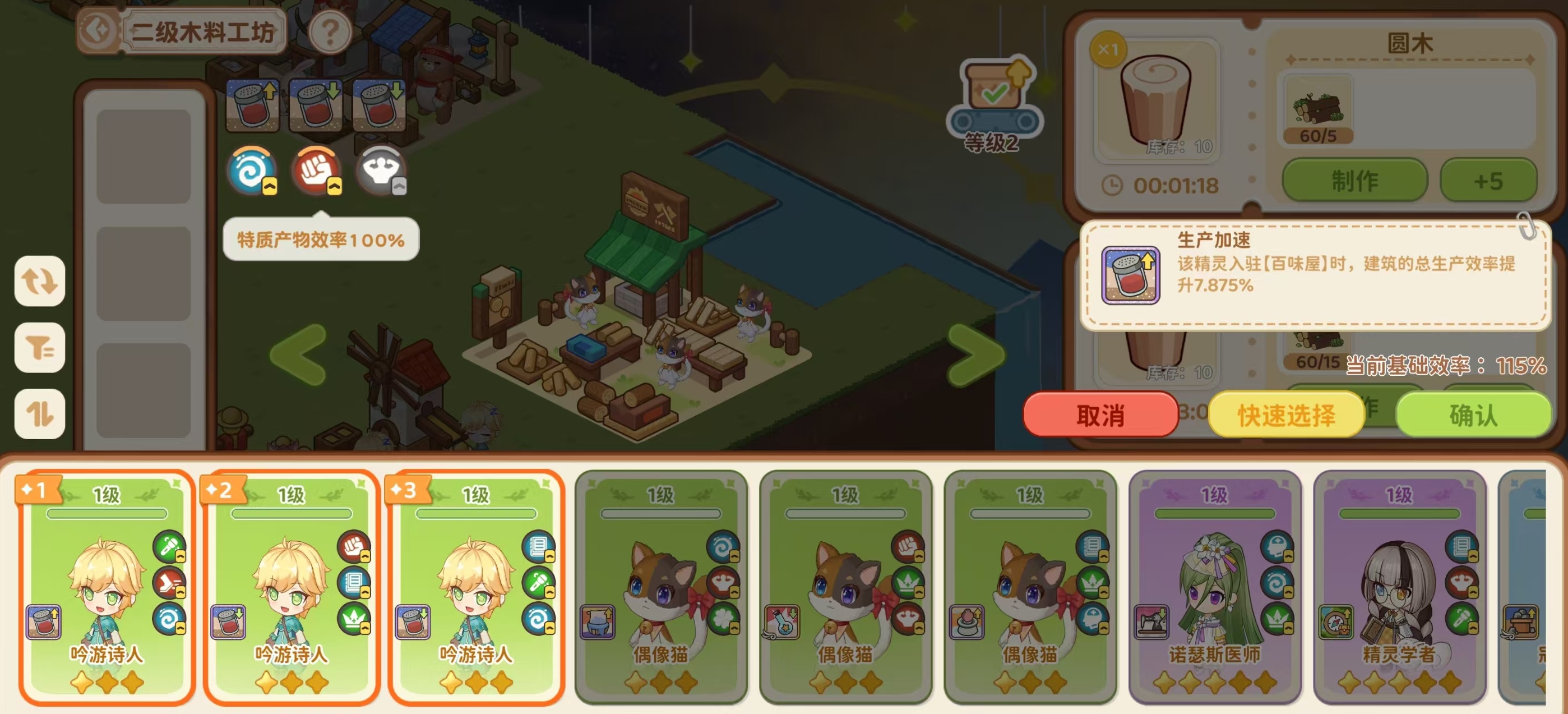 每只精灵在首次获得时,会自动生成一项专属技能,该技能将在对应生活场景中触发增益效果。例如:某精灵在协助烹饪普通品质料理时,有固定概率将其升格为优质品质;另一精灵参与钓鱼活动时,可使判定窗口尺寸扩大5%。除技能外,精灵还携带三项随机生成的“特质”,分别归属红、蓝、绿三类维度,代表其在不同工作环境中的适配倾向。当特质颜色与当前生产建筑所要求的类型一致时,将激活额外效率加成,这是实现高效资源产出的关键策略点。