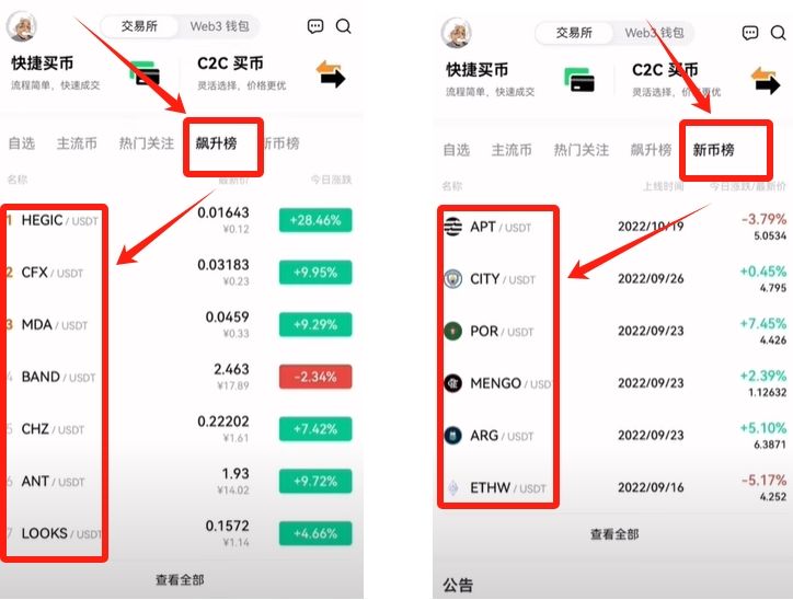 “飙升榜”的意思一般是说他涨幅比较多,比较大的,会进飙升榜的。“新币榜”就是说刚上欧易交易所的币,新币一般起伏会比较大一点,这个大家也可以关注。