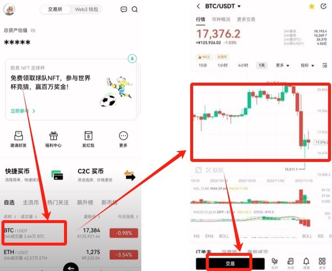 我们演示一下买卖一个比特币。点击“BTC”,就能看到他的线了。点击下方的“交易”,就可以进去交易了。