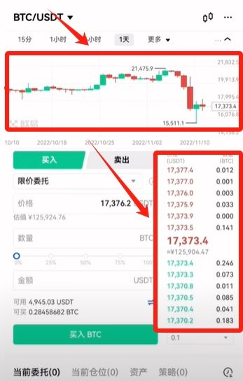 先来讲一下“限价委托”。比如说我现在要买比特币,但是我觉得这个价格有点高,我这边价格可以给他打进去我心仪的价格,比如说17000,我买个1U,点击【买入BTC】。
