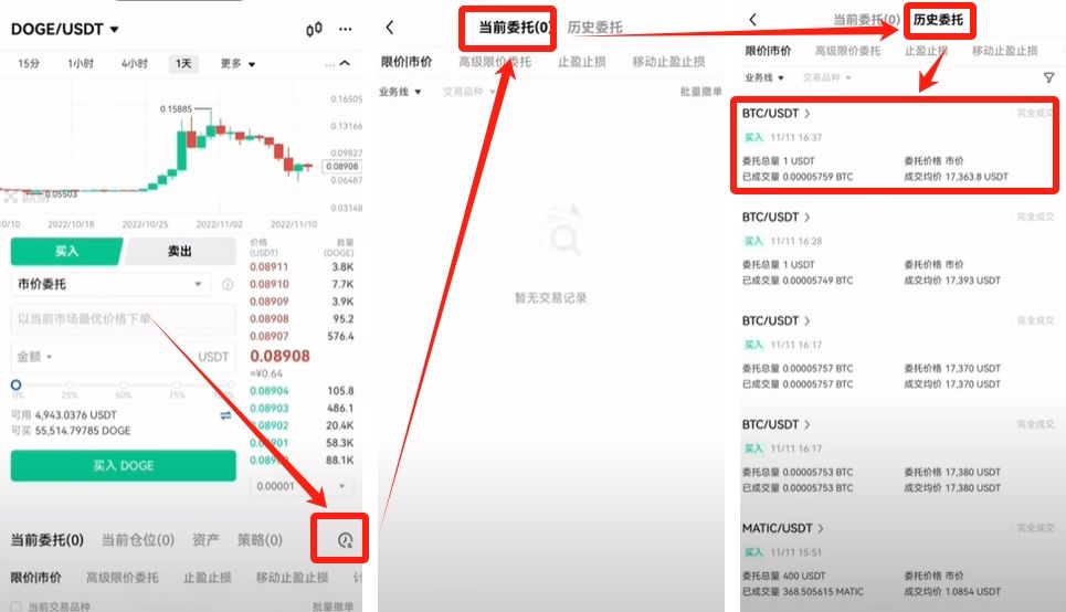 然后跟大家讲一下市价委托。市价委托就是以当前的最优价进行成交,我们点击限价委托,选择“市价委托”,就切换到市价委托的交易模式了。比如说我们要买1U的比特币,输入1U,点击【买入BTC】,它当时就成交了。这个就是说以当前最优价格进行撮合成交。
