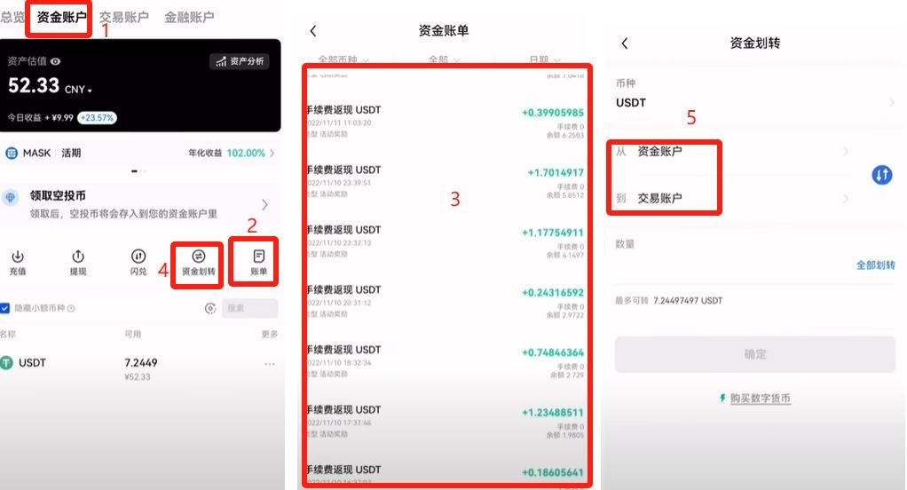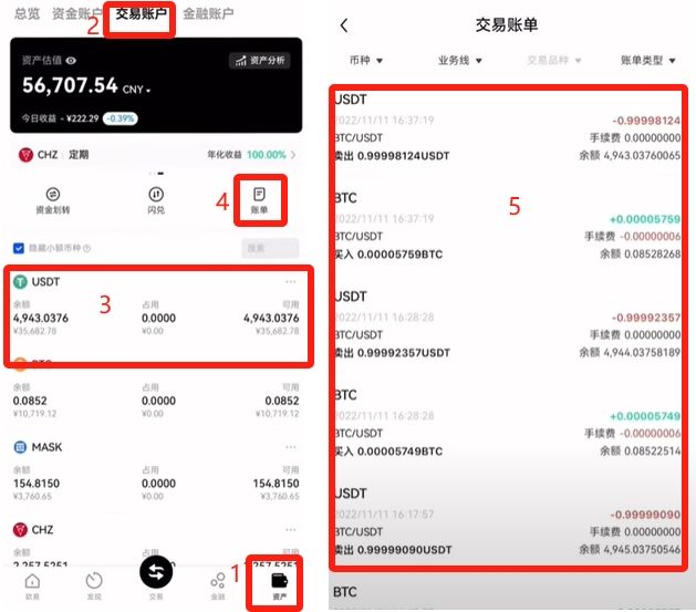 比如说我们买了几个比特币,我去哪里看有多少呢。点击右下角的【资产】,上方点击【交易账户】,我们可以看到我们有多少USDT。现在手上有的是折合成多少软妹币的价格的不同的币,或者是有多少个币,这边都是可以看到。我们要看交易明细就点击”账单“,这里可以看到包括买了多少币,手续费付了多少都是可以看到的。
