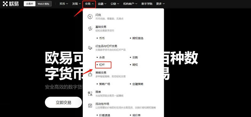 3、点击官网首页左上方【交易】-【杠杆】。