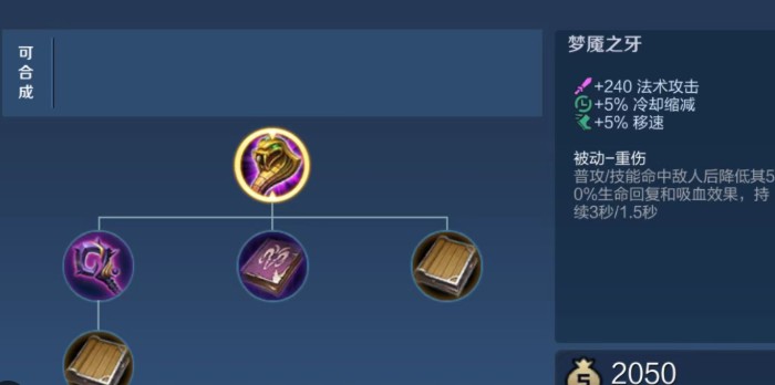 5、根据对手阵容的特点来调整自己的功能性装备和续航装备。如果对方具有很强的生命回复能力,那么梦魇之牙提供的重伤效果和法穿加成就是破局的必带装备。