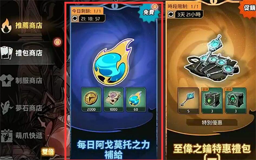 先来说一下,关键就是阿戈摩托之力,这就是大淘金之战的主要体力,每次挑战大概会消耗30个。不要担心不够使用,获取还是比较简单的。首先商店每一天都会有免费的补给,可以直接拿到60个。其次也可以用来去兑换,还可以用梦之金来换。三个梦之金就可以拿到60个,每天还可以更换8次,加上任务所给的奖励,那基本上每天起码可以打5次,所以完全足够大家去刷资源。这里也有一个小技巧,免费领取的是不可以储存的,放着不用就可能会浪费。