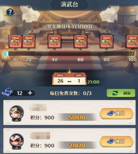 演武场为PvP竞技系统,每日提供三次基础挑战机会,用尽后可通过元宝补充次数。匹配机制基于实时积分排序,胜方获得积分增长,败方仅在应战状态下扣除积分;主动进攻失败不扣分。单场胜利所获积分与对手当前积分正相关——对手积分越高,获胜收益越大。每次成功挑战固定产出演武荣耀币,该货币仅限演武场专属商店兑换道具。