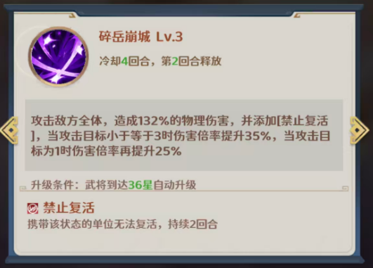 二技能碎岳崩城进一步强化群体压制能力,物理伤害系数提升至121%,并附带【禁止复活】效果。此机制可针对性反制具备复活类辅助技能的角色,尤其克制依赖重生机制续战的治疗或坦克单位。当敌方单位数≤3时,伤害倍率额外提升35%,综合压制效能显著高于破罡乱舞。同时,被施加【禁止复活】状态的目标,在接下来两个回合内无法触发任何复活类效果,战略价值极高,建议优先施放于敌方核心辅助或关键输出位。