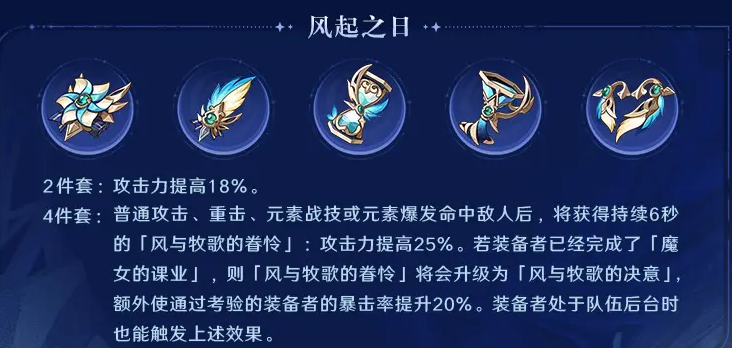 4件:普通攻击、重击、元素战技或元素爆发命中敌人后,将获得持续6秒的「风与牧歌的眷怜」:攻击力提高25%。若装备者已经完成了「魔女的课业」,则「风与牧歌的眷怜」将会升级为「风与牧歌的决意」,额外使通过考验的装备者的暴击率提升20%。装备者处于队伍后台时,也能触发上述效果。