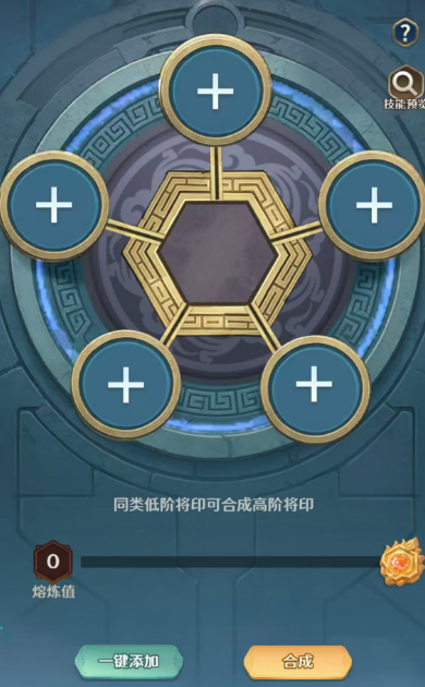 “将印”系统采用同品质合成机制:使用2枚或5枚同品质将印进行融合,即可触发升级。合成成功率随投入数量增加而提升,满额合成时成功率为100%。该系统为武将提供额外属性维度,与装备形成互补性成长结构。