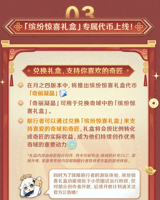 旅行者可以通过兑换「缤纷惊喜礼盒」来支持喜爱的奇域和奇匠,礼盒将会按比例转化成奇匠的实际收益,成为他们持续创作优秀奇域的重要动力