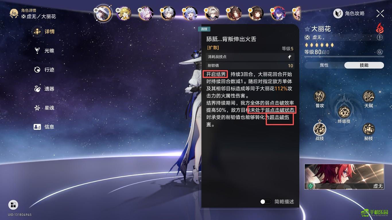 开启结界,持续3回合,大丽花回合开始时持续回合数减1。随后对指定敌方单体及其相邻目标造成等同于大丽花112%攻击力的火属性伤害。结界持续期间,我方全体的弱点击破效率提高50%,敌方目标未处于弱点击破状态时承受的削韧值也能够转化为超击破伤害。