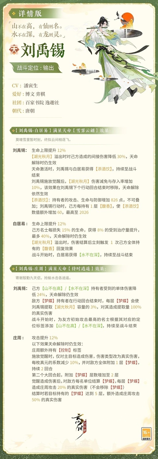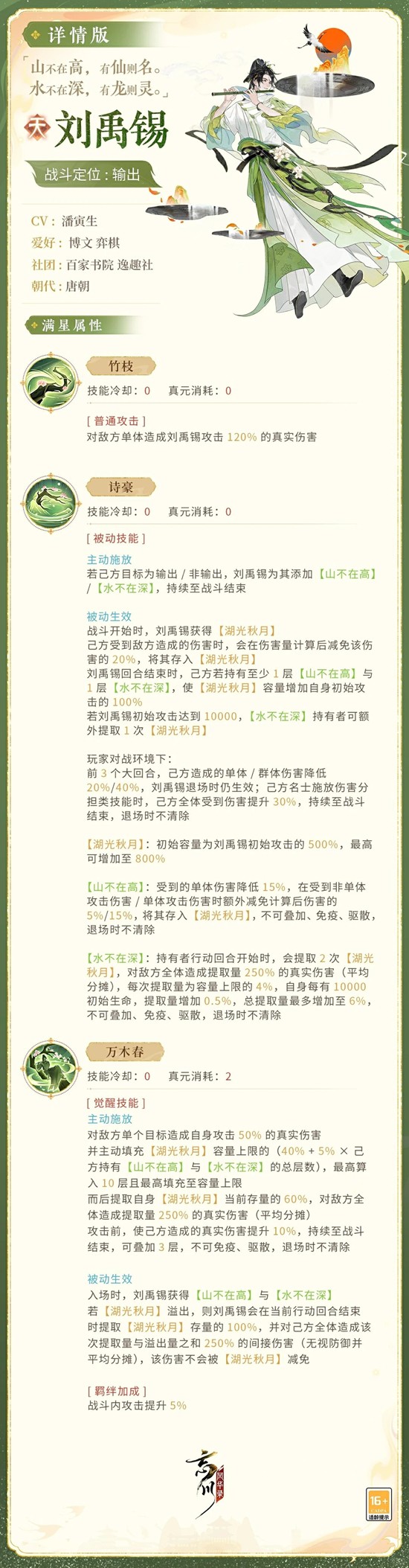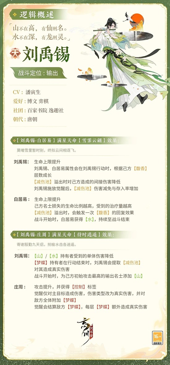 刘禹锡笔下既有面对宦海沉浮的坦荡,也有 “何陋之有” 的旷达,其执笔明志的生涯为技能设计灵感源泉。 在忘川中,刘禹锡将作为输出名士登场,使君大人可点击下图,细品梦得诗镌傲骨,笔写千秋的风采!小麒麟抱来了详细的刘禹锡技能,使君大人快来看看吧!具体技能效果以上线实装为准哦~